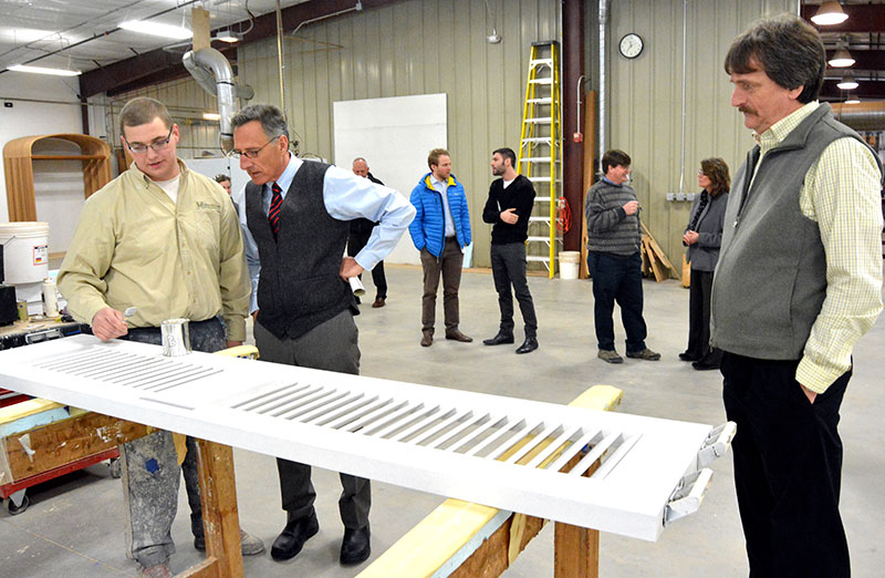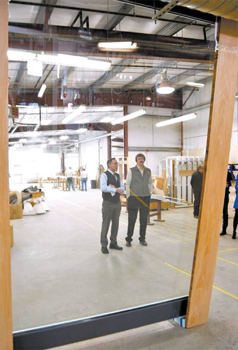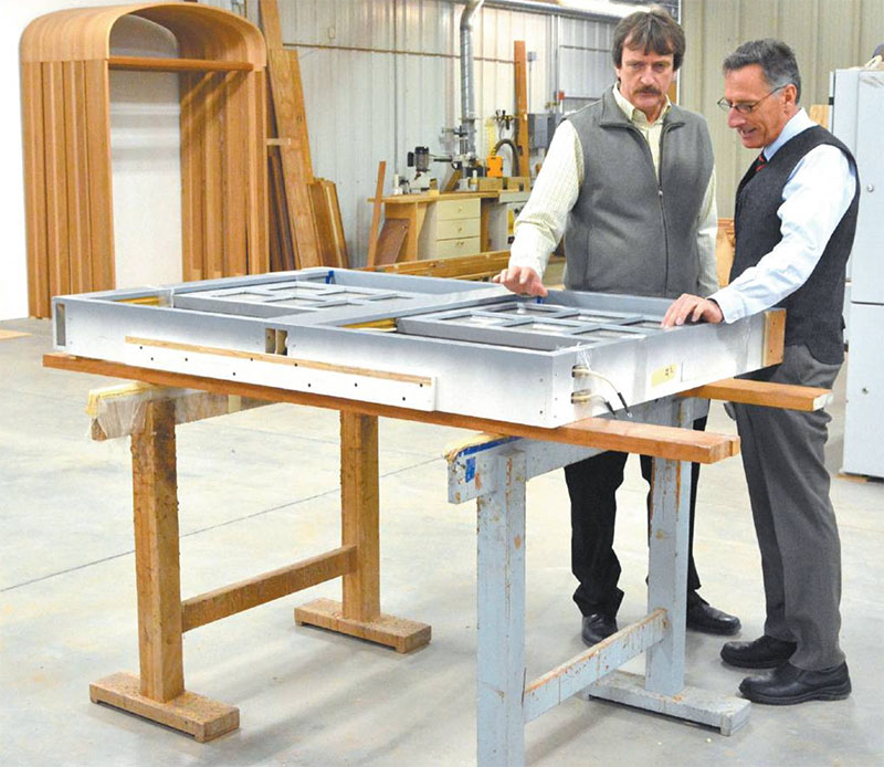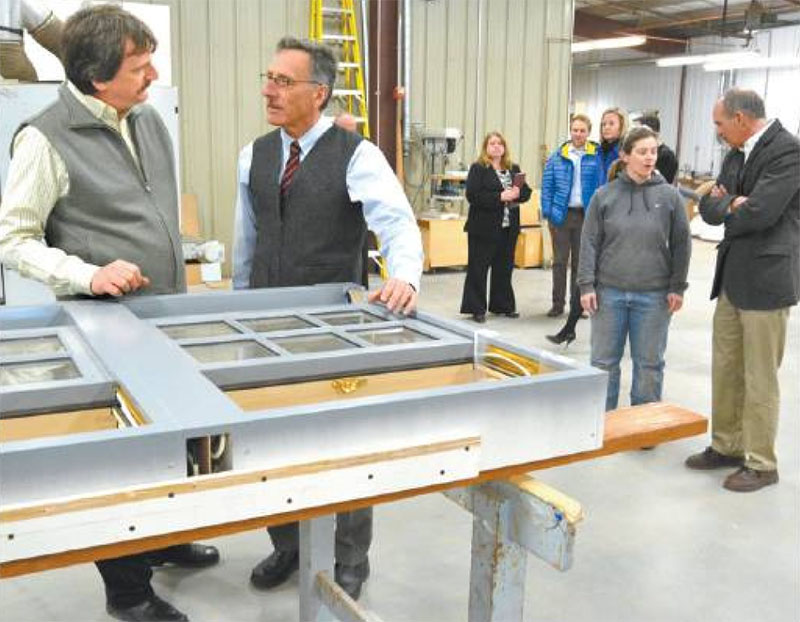 Rolf Hirschmann, left, explains the latest technological innovations in window manufacturing to Gov. Peter Shumlin, who toured Hirschmann Windows and Frames in West Rutland.